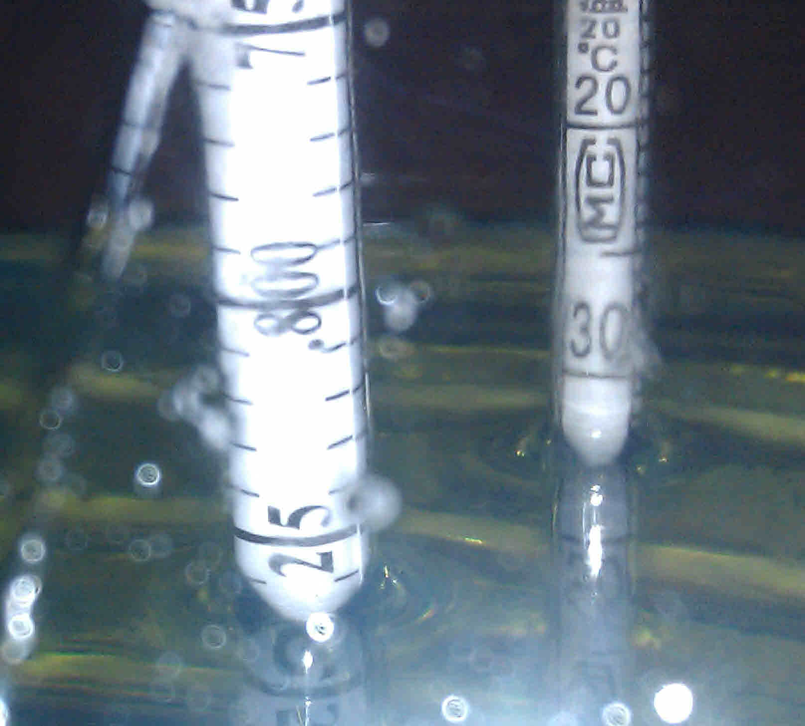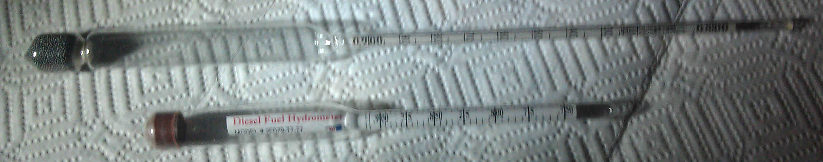 It is hard to get photos of the hydrometer floating in fuel so we took one of them side by side - and on the right is the one that ships with this - showing .831 API - and the other showing essentially the same measurement but is really hard to read because the next graduation mark is just showing  at the liquid level which could be .830 or .831 or even .829. - and -  this is floating in out of the pump diesel fuel.  That is about 43 cetane - at the pump